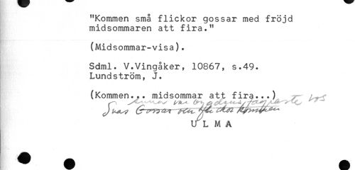 //// "Kommen små flickor gossar med fröjd //// midsommaren att fira." //// (Midsommar-visa). //// Sdml. V.Vingåker, 10867, s.49. //// Lundström, J. //// (Kommen... midsommar att fira...) //// U ^L M A ////