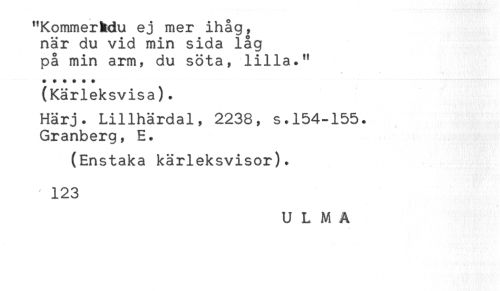 //// "Kommerhdu ej mer ihåg, //// när du vid min sida låg //// på min arm, du söta, lilla." //// + + + * + * //// (Kärleksvisa). //// Härj. Lillhärdal, 2238, s.154-155. //// Granberg, E. //// (Enstaka kärleksvisor). //// ' 123 //// ULMA ////
