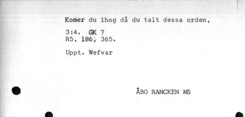//// * t //// Komer du ihog då du talt dessa orden, //// 3:4. GK ? //// R5, 186, 365. //// Uppt. Wefvar //// # ÅBO RANCKEN MS //// . ////