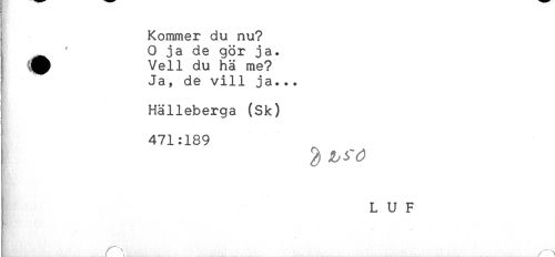 //// Kommer du nu? //// i ^ ' 0 ja de gör ja. //// ^ Vell du hä me? //// ' Ja, de vill ja... //// I Hälleberga (Sk) //// 471:189 //// L U F ////