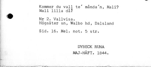 //// Kommer du vall te' månda^n, Mali? //// Mali lilla då! //// Hy' . //// ^ Nr 2. Vallvisa. //// Högsäter sn, Walbo hd, Dalsland //// Sid. 16. Mel. not. 5 str. //// - //// DYBECK RUNA //// MAJ-HAFT. 1844. ////