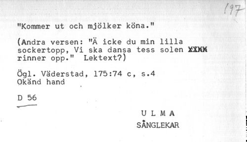 //// - ?r //// "Kommer ut och mjölker köna." //// - - t //// - //// (Andra versen: "Ä icke du min lilla //// sockertopp, Vi ska dansa tess solen XXKX //// rinner opp." Lektext?) //// ! //// i //// Ögl. Väderstad, 175:74 c, s.4 //// Okänd hand ; //// ' ' ! //// D 56 //// t ! //// U L M A ; //// SÅNGLEKAR ! ////