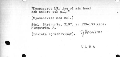 //// "Kompassros bär jag på min hand //// och ankare och pil." //// ! //// (Sjömansvisa med mel.) //// Sdml. Strängnäs, 2197, s. 129-130 kaps. //// Ringström, A. //// (Enstaka sjömansvisor). ^ ^ ^ '' ////