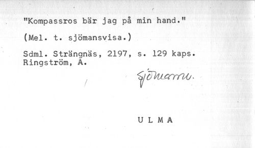 //// "Kompassros bär jag på min hand." //// (Mel. t. sjömansvisa.) //// Sdml. Strängnäs, 2197, s. 129 kaps. //// Ringström, A. //// - < //// U L M A ////