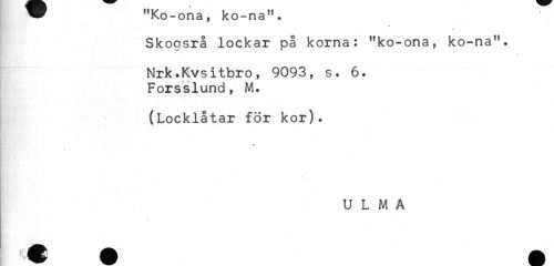 //// ^ r^o-ona, Ko-na". //// Skogsrå lockar på korna: "ko-ona, ko-na". //// Nrk.Kvsitbro, 9093, s. 6. //// Forsslund, M. //// (Locklåtar för kor). //// ULMA //// € # * ////