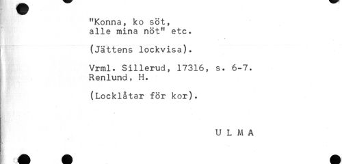 //// "Konna, ko söt, //// alle mina nöt" etc. //// (Jättens lockvisa). //// Vrml. Sillerud, 17316, s. 6-7. //// Renlund, H. //// (Locklåtar för kor). ////