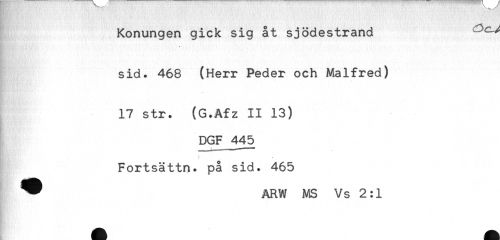 //// Konungen gick sig åt sjödestrand ^ //// sid. 468 (Herr Peder och Malfred) //// 17 str. (G.Afz II 13) //// DGF 445 //// Fortsättn. på sid. 465 //// * ARW MS Vs 2:1 //// - ////