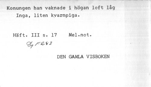 //// Konungen han vaknade i högan loft låg //// Inga, liten kvarnpiga. //// Häft. III s. 17 Mel.not. //// DEN GAMLA VISBOKEN ////
