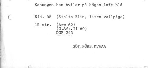 //// Konungen han hvilar pa högan loft bla //// ( Sid. 58 (Stolts Elin, liten vallpiga) //// 15 str. (Arw 62) //// (G.Afz.II 60) //// DGF 243 //// GÖT.FÖRB.KVHAA ////