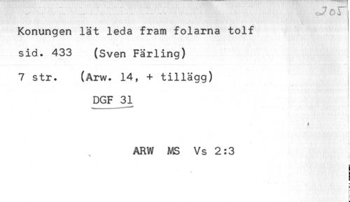 //// - - ^ . ....... - - ; ^ - ' C^OJ //// Konungen lät leda fram folarna tolf //// sid. 433 (Sven Färling) //// 7 str. (Arw. 14, + tillägg) //// DGF 31 //// ... //// f //// ARW MS Vs 2:3 //// ) //// j //// } //// s- ////