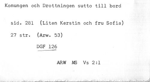 //// honungen ocn Drottningen sutto till bord //// sid. 281 (Liten Kerstin och fru Sofia) //// 27 str. (Arw. 53) //// DGF 126 //// ARW MS Vs 2:1 //// ......^ ___ . ^^ -___. ____ --- ////