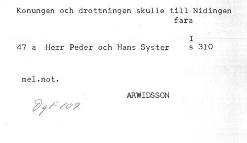 //// Konungen och drottningen skulle till Nidingen //// fara //// ^ *. //// I //// 47 a Herr Peder och Hans Syster s 310 //// * * //// mel.not. //// ARWIDSSON ////