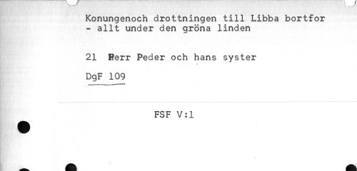 //// Konungenoch drottningen till Libba bortfor //// - allt under den gröna linden //// 21 Berr Peder och hans syster //// y //// DgF 109 //// FSF V:1 ////