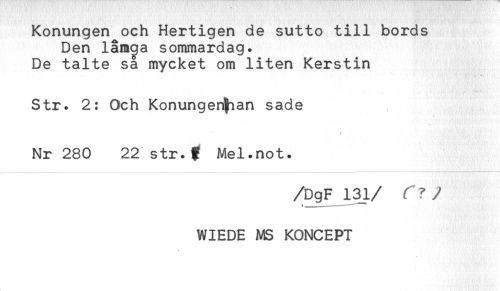 //// Konungen och Hertigen de sutto till bords //// Den låm^a sommardag. //// De talte sa mycket om liten Kerstin //// Str. 2: Och Konungen^ian sade //// * //// Nr 280 22 str.f Mel.not. //// /DgF 131/ f?/ //// WIEDE MS KONCEPT ////
