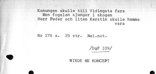 //// - - — , - ^ - - ^ - . t //// Konungen skulle till Vidingsta fara //// Men fogelen sjunger i skogen //// Herr Peder och liten Kerstin skulle hemma //// vara //// Nr 278 a. 25 str. Mel.not. //// - //// /DgF 109/ //// ^ WIEDE MS KONCEPT ////
