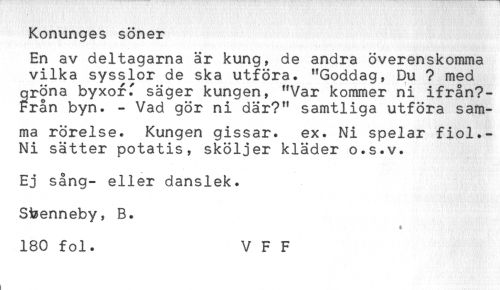 //// Honunges söner //// En av deltagarna är kung, de andra överenskomma //// vilka sysslor de ska utföra. "Goddag, Du ? med //// qröna byxor^ säger kungen, "Var kommer ni ifrån?- //// Från byn. - Vad gör ni där?" samtliga utföra sam- //// ma rörelse. Kungen gissar, ex. Ni spelar fiol.- //// Ni sätter potatis, sköljer kläder o.s.v. //// Ej sång- eller danslek. //// Stzenneby, B. //// 180 fol. V F F ////