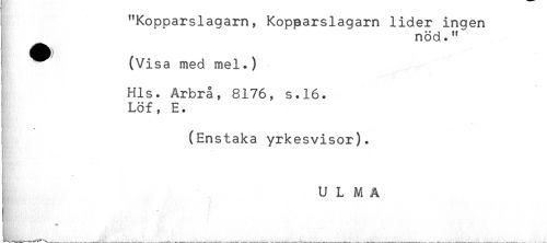 //// i "Kopparslagarn, Kopparslagarn lider ingen //// , nöd." //// ^^ (Visa med mel.) //// Hls. Arbrå, 8176, s.16. //// Löf, E. //// (Enstaka yrkesvisor). //// ! //// ' //// B* //// TM/Htt ' ' ' ' i'' * ////