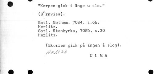 //// * "Korpen gick i änge u slo." //// t //// (Barnvisa). //// Gotl. Gothem, 7084, s.66. //// Herlitz. //// Gotl. Stenkyrka, 7085, s.30 //// Herlitz. //// (Ekorren gick på ängen å slog). //// ULMA ////
