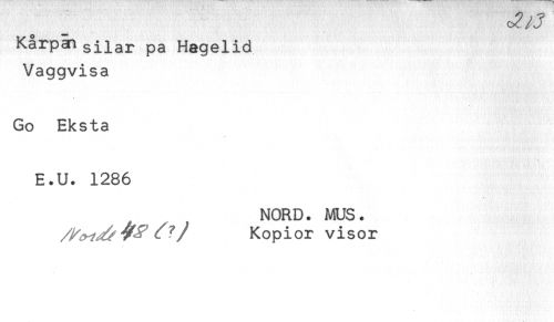 //// Kårpm si.iar pa Hagelid //// Vaggvisa //// Go Eksta //// E.U. 1286 //// NORD. MUS. //// Kopior visor ////