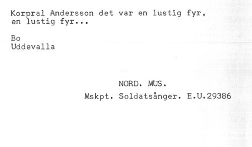 //// Korpral Andersson det var en lustig fyr, //// en lustig fyr... //// Bo //// Uddevalla //// NORD. MUS. //// Mskpt. Soldatsånger. E.U.29386 ////