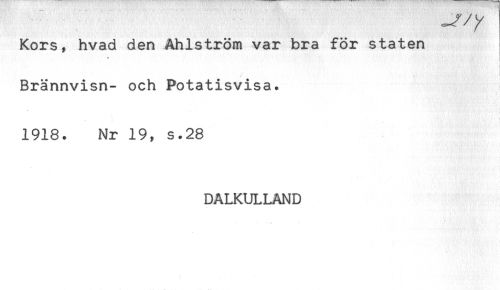 //// Kors, hvad den Ahlström var bra för staten //// . //// Brännvisn- och Potatisvisa. //// 1918. Nr 19, s.28 //// DALKULLAND //// — * ////
