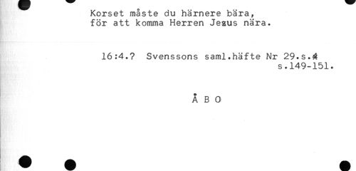 //// Korset måste du härnere bära, //// för att komma Herren Jesus nära. //// 16:4.? Svenssons saml.häfte Nr 29.s.4 //// s.149-151. //// ÅBO ////