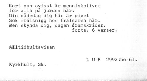 //// Kort och ovisst ar menmskolivet //// för alla på jorden här. //// Din nådedag dig här är givet //// Sök frälsnigg hos frälsaren här. //// Men skynda dig, dagen framskrider. //// forts. 6 verser. //// * //// A$ltidhultsvisan //// L U F 2992:56-61. //// Kyrkhult, Sk. //// * ////