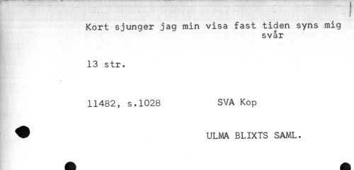 //// .. „ .. . - ' - - - //// Kort sjunger jag min visa fast tiden syns mig //// svår //// 13 str. //// 11482, s.1028 SVA Kop //// ^ ULMA BLIXTS SAML. ////