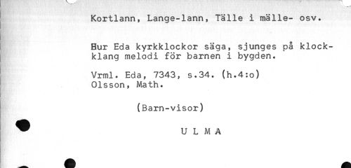 //// Kortlann, Lange-lann, Tälle i mälle- osv. //// Bur Eda kyrkklockor säga, sjunges på klock- //// klang melodi för barnen i bygden. //// Vrml. Eda, 7343, s.34. (h.4:o) //// Olsson, Math. //// (Barn-visor) //// ^ U L M A ////