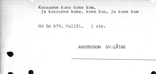 //// Kossarne kone kone kom, //// ja kossorne kone, kone kom, ja kone kom //// p. . - //// Hd Gd 679, Vallat, 1 str. //// i //// . //// ^ ANDERSSON SV.LÅTAR //// --- ////