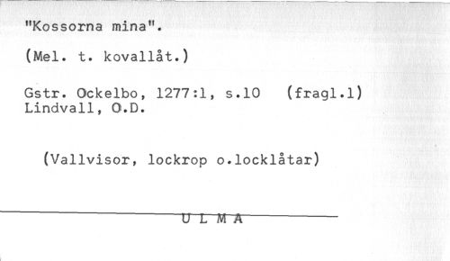 //// "Kossorna mina". //// (Mel. t. kovallåt.) //// Gstr. Ockelbo, 1277:1, s.10 (fragi.l) //// Lindvall, O.D. //// * //// (Vallvisor, lockrop o.locklåtar) //// U L M A-- ////