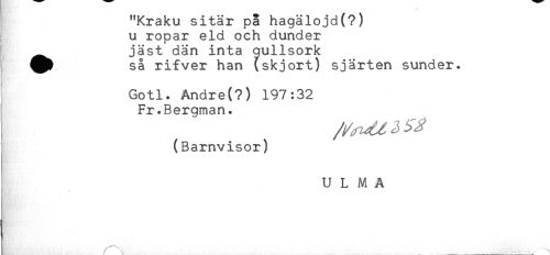 //// "Kraku sitär på hagälojd(?) //// u ropar eld och dunder //// jäst dän inta qullsork //// så rifver han (skjort) sjärten sunder. //// Gotl. Andre (?) 197:32 //// Fr.Bergman. //// (Barnvisor) //// U L M A //// ^ r^.., __ , ////
