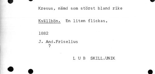 //// Kresus, nämd som störst bland rike //// Kvällbön. En liten flickas, //// 1882 //// J. And.Friselius //// ? //// L U B SKILL.UNIK //// {. - - " H ////