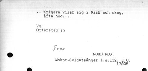 //// ! //// ----. . - .. . .. .. //// .. Krigarn vilar sig i Mark och skog, //// åfta nog... //// Vg //// Otterstad sn //// I J^^t^ //// ^ NORD.MUS. //// Mskpt.Soldatsånger I.s.132. E.U. //// 17805 ////