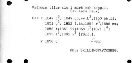 //// Krigarn vilar sig i mark och skog... //// (av Lars Feuk) //// Se: E 1847 c^; 1849 pp,vv,b^;1850 bb,H; //// 1851 g^; 1852 i,tt;1854 r^;1856 mm; //// 1858 t;1861 ii;1865 1^;1871 //// 1873 t^;1895 v^ (förf.). //// Y 1856 c //// KB:s SKILLINGTRYCKSREG. ////