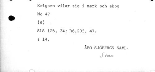 //// Krigarn vilar sig i mark och skog //// ! //// No 47 //// * (R) //// SLS 126, 34; R6,203, 47. //// j s 14. //// ÅBO SJÖBERGS SAML. //// J ////