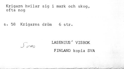 //// Krigarn hvilar sig i mark och skog, //// ofta nog //// s. 58 Krigarns dröm 6 str. //// LASENIUS' VISBOK //// FINLAND kopia SVA //// (< ' '"['fy*'''-'''.'.'-.' \ .* //// ^^^ . .....^ . , ___ . ___^ ^^^^^ . ^ . : ,, .. ////