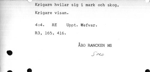 //// krigarn nviiar sig i mark och skog, //// Krigare visan. //// 4:4. RE Uppt. Wefvar. //// R3, 165, 416. //// ÅBO RANCKEN MS //// — ////