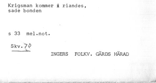 //// krigsman Kommer x nandes, //// sade bonden //// * //// s 33 mel.not. //// Skv.?P //// " INGERS FOLKV. GÄRDS HÄRAD ////