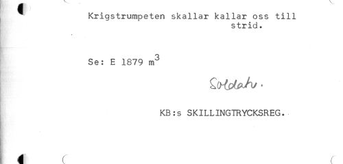 //// Krigstrumpeten skallar kallar oss till //// strid. //// Se: E 1879 m^ //// KB:s SKILLINGTRYCKSREG. //// K' //// i r ////