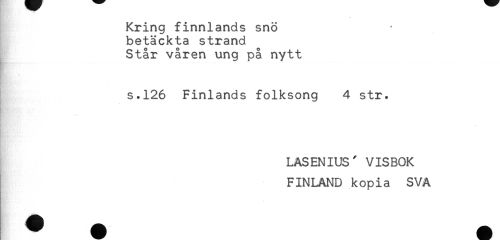 //// Kring finnlands snö //// betäckta strand //// Står våren ung på nytt //// - //// s.126 Finlands folksong 4 str. //// - //// LASENIUS' VISBOK //// f //// FINLAND kopia SVA ////