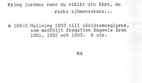 //// t\ring joraens jLurtu uu uu //// raska sjömansskara... //// A 180:2 Hyllning 1853 till världsomseglarne, //// som medföljt fregatten Eugenie åren //// 1851, 1852 och 1853. 6 str. //// RA ////