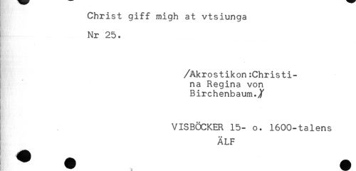 //// Christ giff migh at vtsiunga //// Nr 25. //// t //// /Äkrostikon Christi- //// na Regina von //// Birchenbaum./ //// VISBÖCKER 15- o. 1600-talens //// ÄLF ////