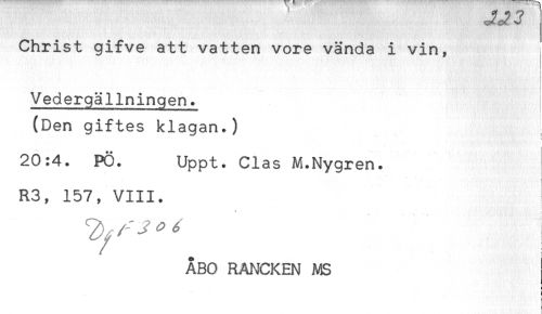 //// Christ gifve att vatten vore vända i vin, i //// Vedergällningen. //// (Den giftes klagan.) //// ! //// 20:4. PÖ. Uppt. Clas M.Nygren. //// R3, 157, VIII. //// - //// ÅBO RANCKEN MS ////