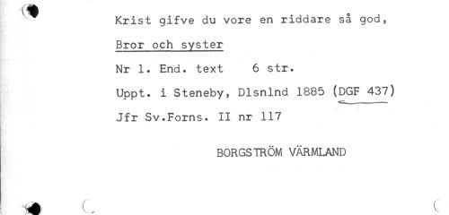 //// Krist gifve du vore en riddare så god, //// Bror och syster //// Nr 1. End. text 6 str. //// Uppt. i Steneby, Dlsnlnd 1885 (DGF 437) //// Jfr Sv.Forns. II nr 117 //// * //// BORGSTRÖM VÄRMLAND //// 'K* ( _ ( ////