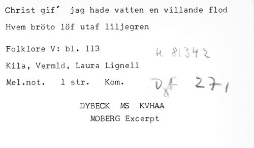 //// Christ gif jag hade vatten en villande iiod //// Hvem bröto löf utaf liljegren //// Folklore V: bl. 113 r. ^ h s //// o t. j f 4 //// Kila, Vermld, Laura Lignell //// Me1.n o t. 1 str. Kom. "'?) ^ y . //// DYBECK MS KVHAA //// MOBERG Excerpt ////