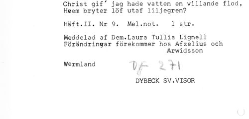 //// H^em bryter löf utaf liljegren? //// Haft.II. Nr 9. Mel.not. 1 str. //// Meddelad af Dem.Laura Tuilia Lignell //// Förändringar förekommer hos Afzelius och //// Arwidsson //// Wermland //// C * //// DYBECK SV.VISOR //// ( ////