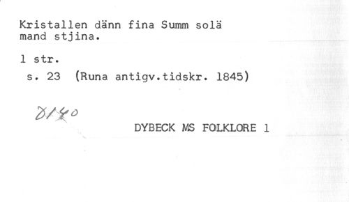 //// Kristallen dänn fina Summ sola //// mand stjina. //// 1 str. //// s. 23 (Runa antigv.tidskr. 1845) //// DYBECK MS FOLKLORE 1 //// Si; * ////