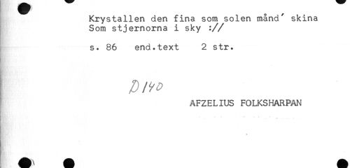 //// Krystallen den fina som solen månd' skina //// Som stjernorna i sky :// //// s. 86 end.text 2 str. //// ' AFZELIUS FOLKSHARPAN //// B?^.' - - ? ^ - //// s. ////