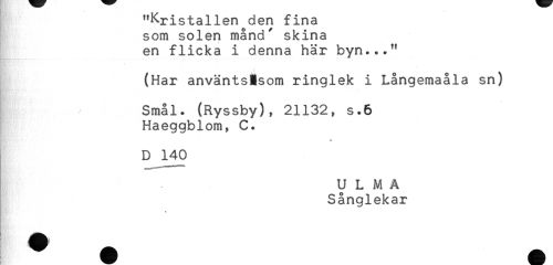 //// "Kristallen den fina //// som solen månd' skina //// en flicka i denna här byn..." //// (Har använts)som ringlek i Långemaåla sn) //// E ^ Smal. (Ryssby), 21132, s.6 //// Haeggblom, C. //// * //// D 140 //// ULMA //// Sånglekar ////
